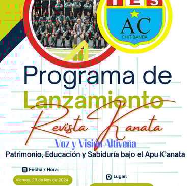 📢 La Institución Educativa Altiva Canas tiene el agrado de invitar a toda nuestra comunidad y público en general al lanzamiento oficial de nuestra revista institucional, "K’anata: Voz y Visión Altiveña". Este evento marca un hito en nuestra historia educativa y cultural, destacando el esfuerzo y compromiso de estudiantes, docentes y colaboradores.